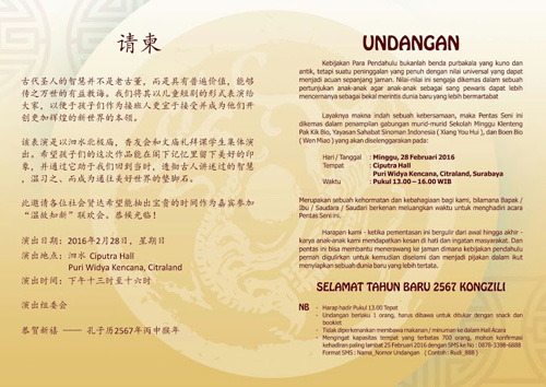 Layaknya makna indah sebuah kebersamaan, Pentas Seni “Sincia 2567 Dalam Gerak Dan Lagu” dikemas dalam penampilan gabungan murid-murid Sekolah Minggu Klenteng Pak Kik Bio, Yayasan Sahabat Sinoman Indonesia (Xiang You Hui), dan Boen Bio (Wen Miao) yang telah diselenggarakan pada hari Minggu 28 Februari 2016, Di Ciputra Hall Puri Widya Kencana, Citraland, Surabaya, Pukul 13.00 s/d 16.00 WIB.